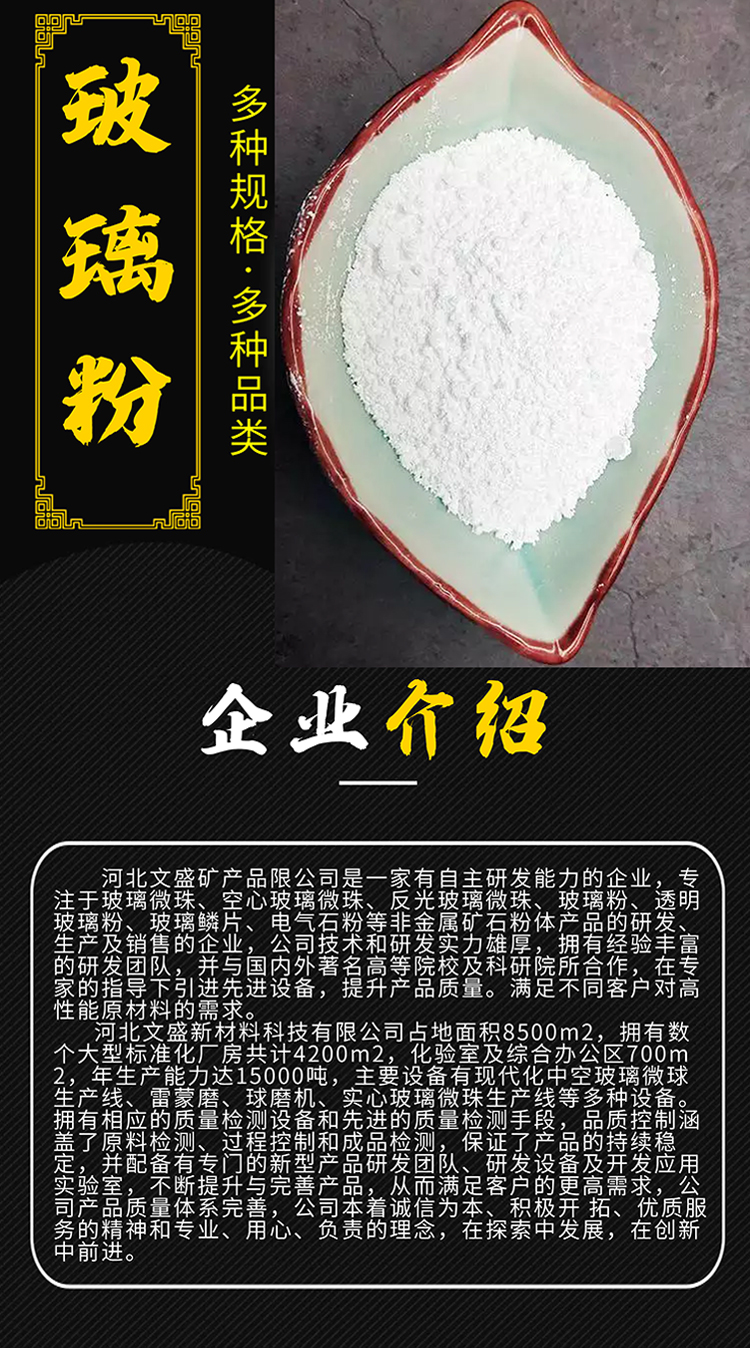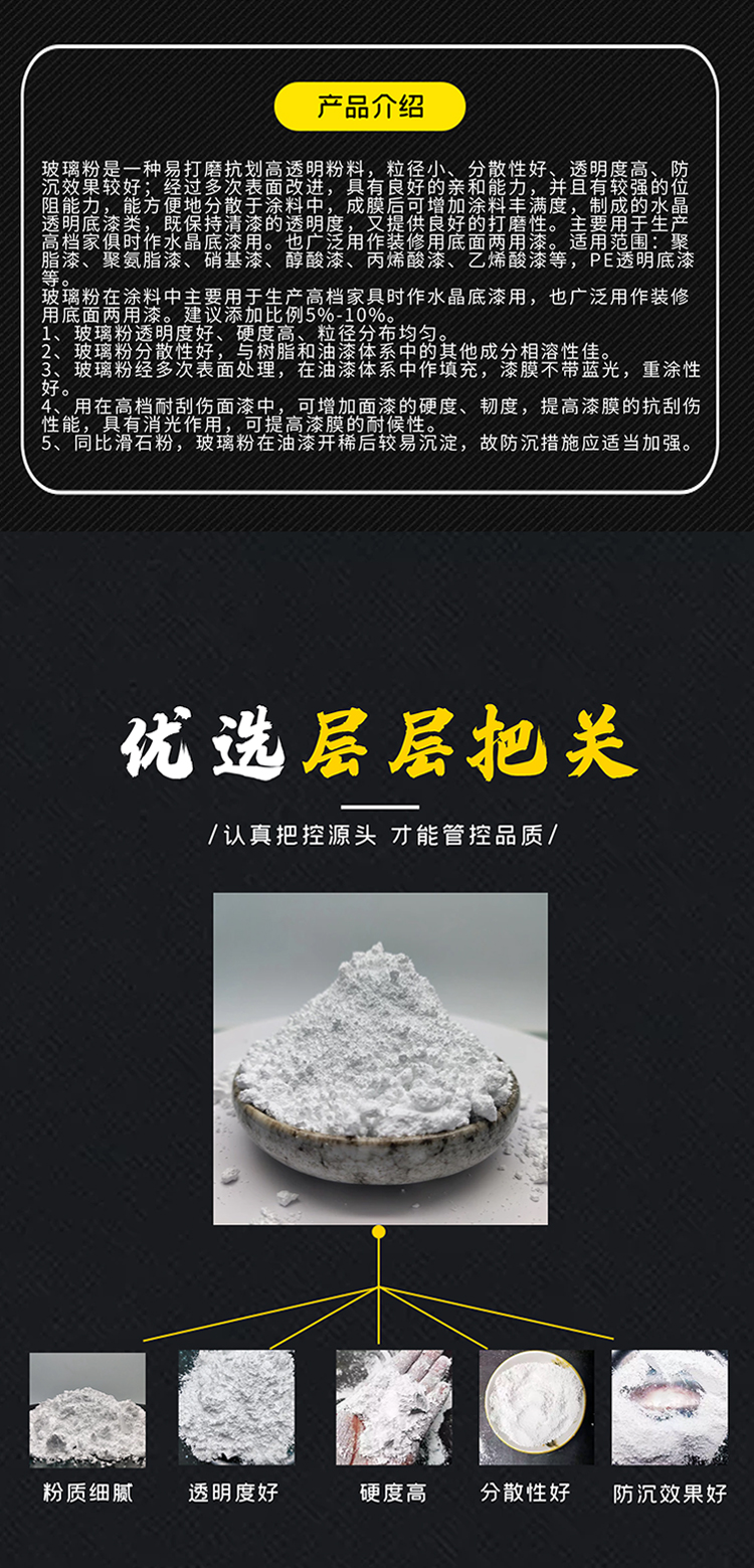 胶水地坪漆用玻璃粉 丙烯酸树脂用2000目透明粉我公司出产的透明玻璃粉无铅高透明,已经大量应用在环氧树脂真瓷胶美缝剂行业,经过反复测试不改变真瓷胶性能,具有增硬高填充性可以有效的降低环氧真瓷胶美缝剂的生产成本,欢迎各个厂家免费拿样测试。提供生产工艺。