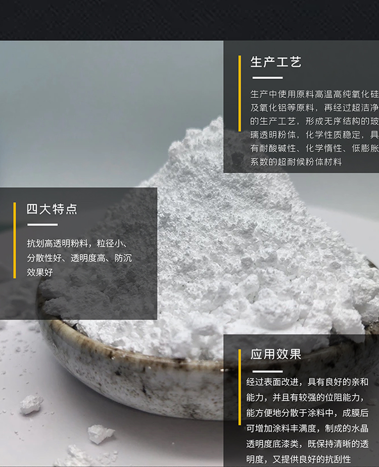 河北文盛科技生产透明高品质白色超细透明粉厂家,透明粉是一个俗名,透明粉并不是一种单一的粉体,它除了主要成份天然矿岩外,还添加专用的合成辅料混合研磨改性调制而成。主要成份是含镁、铝、钙的复合硅酸盐,属无机盐。另外含部分硫酸盐和杂质,透明粉是一种新型的功能性的透明填充料,具有透明度高,硬度好,色相佳,高光泽,抗塌陷性好及使用时扬尘少等特点。广泛应用于油性家具漆,装修漆,胶粘剂、油墨、丙烯酸树脂、环氧树脂及塑料中。起初,透明粉仅仅应用于油性木器漆中,在几年时间里,从单一的油漆行业到涂料行业,再到整个化工行业,透明粉作为一种性能突出,更加经济、环保,使用更加放心的功能型透明填充料,成为化工行业的一种优良透明填充料。